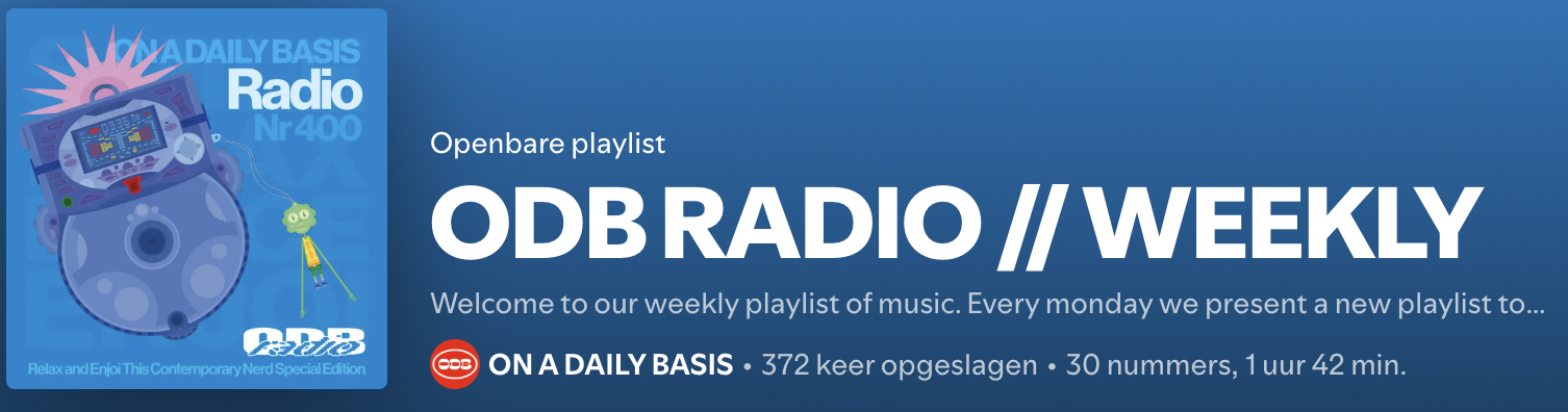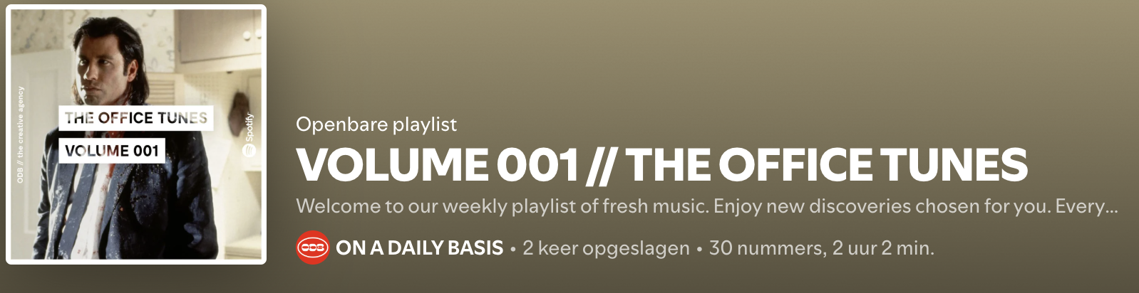 Muziek is nog altijd een essentieel onderdeel van wie we zijn. Daarom lanceerden we op 4 juni 2017 ODB Radio: een wekelijkse playlist op Spotify met 30 tracks, geselecteerd door Pim. Om te draaien op kantoor, onderweg of gewoon in je weekend.