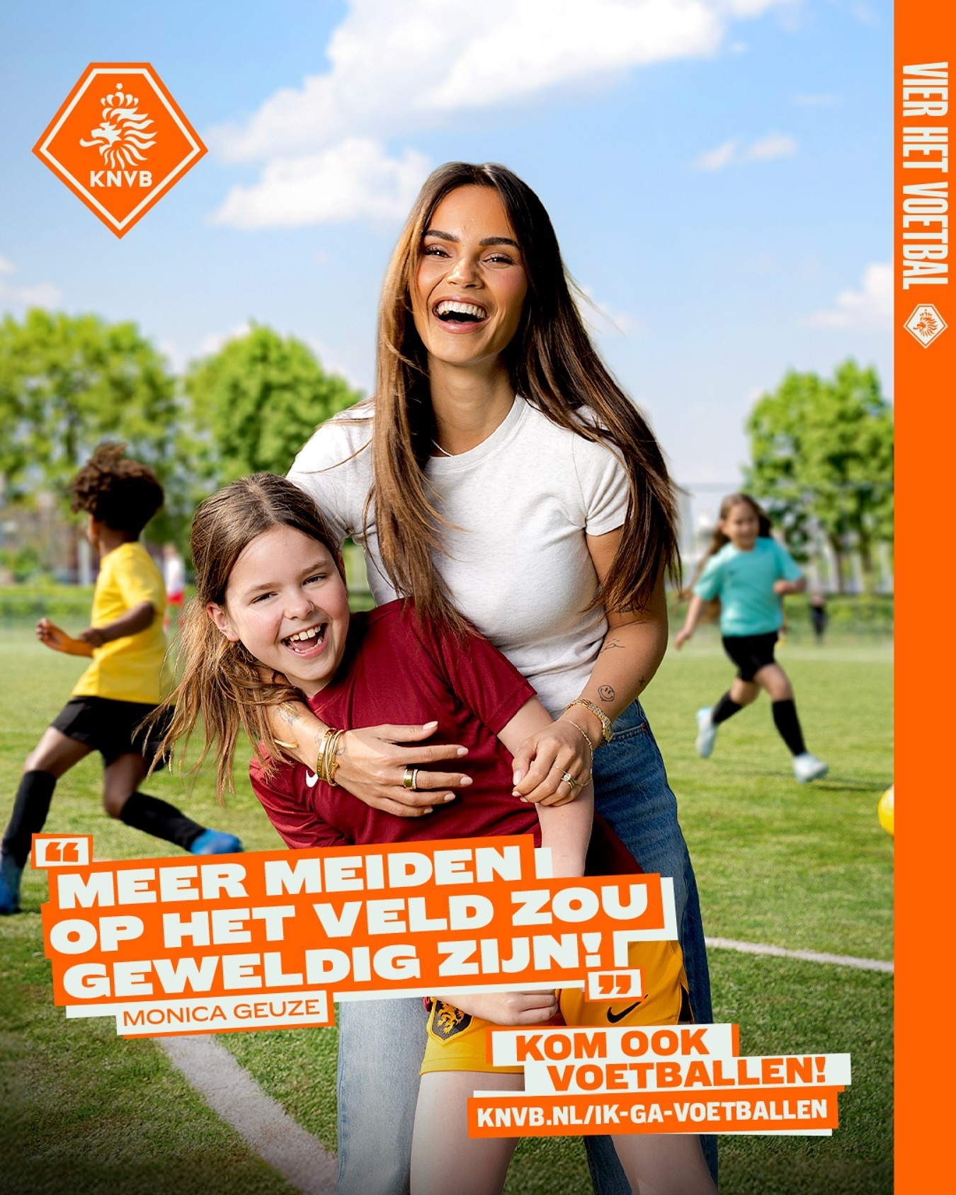 We kozen bewust voor Monica Geuze als gezicht van de campagne. Niet alleen omdat ze bekend is, maar omdat ze zelf moeder is van een dochter die voetbalt. Ze weet precies hoe het voelt om op zaterdag langs de lijn te staan, en dat maakt haar verhaal geloofwaardig. Geen rol spelen, maar gewoon haarzelf zijn.